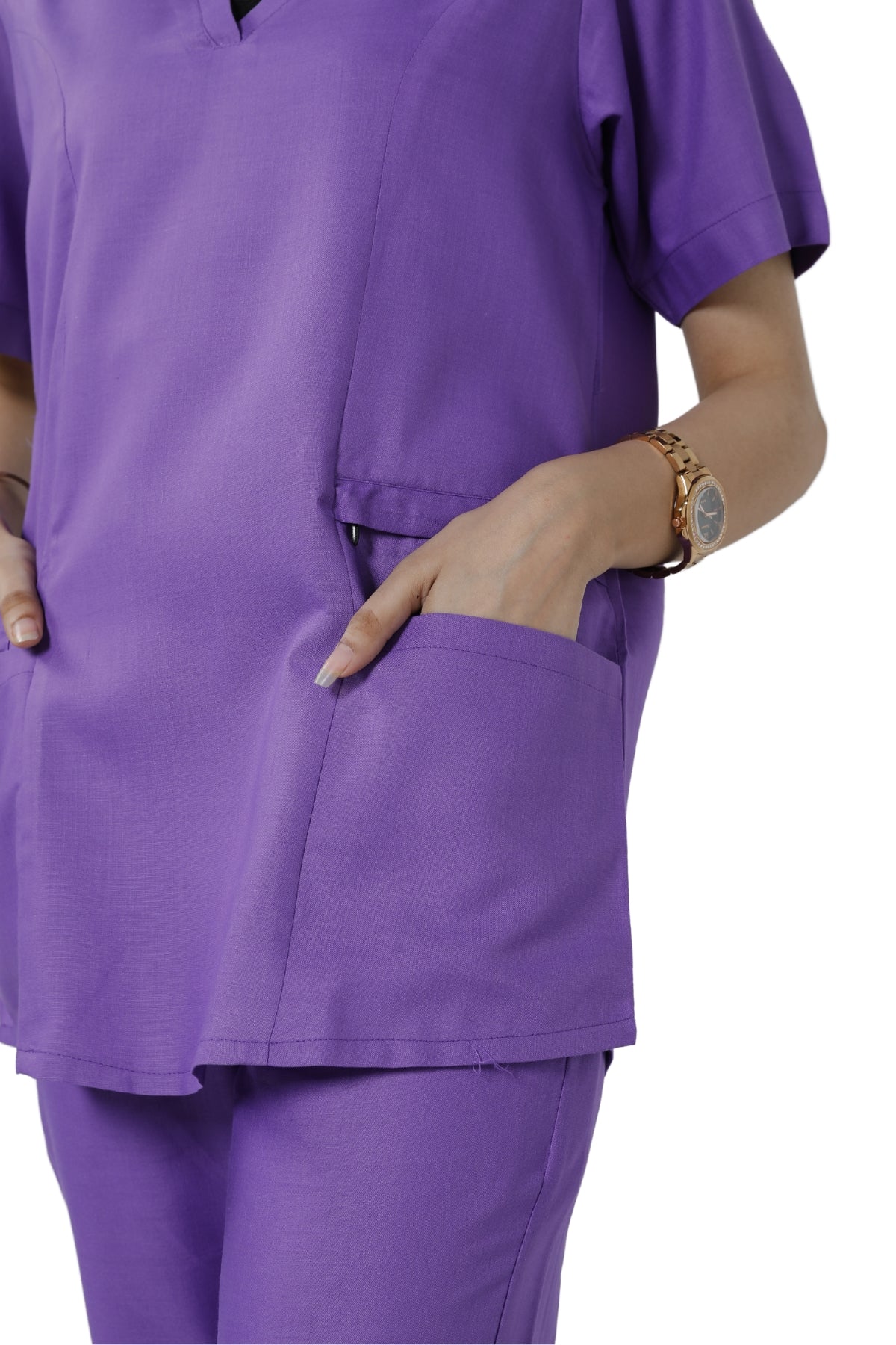 Designed with the specific needs of hematologists in mind, the Women's Premium Scrub Set from Clozzi combines functional design with an elegant aesthetic. Crafted for comfort and utility, this set features a sophisticated V-neckline top paired with crisply creased trousers, creating a smart fit that is both flattering and professional.